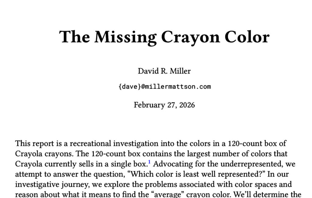 This report is a recreational investigation into the colors in a 120-count box of Crayola crayons. The 120-count box contains the largest number of colors that Crayola currently sells in a single box. Advocating for the underrepresented, we attempt to answer the question, “Which color is least well represented?” In our investigative journey, we explore the problems associated with color spaces and reason about what it means to find the “average” crayon color. We’ll determine the largest gap in hue coverage then find the largest color void in perceptual 3D color space.